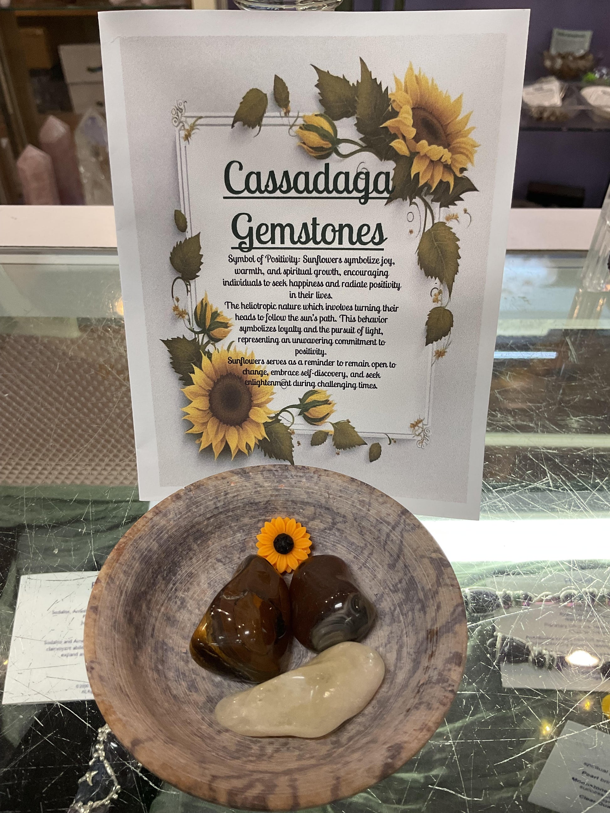 The kit contains three intuitively selected gemstones, a organza bag to carry your stones and information on the gemstones that were selected.
