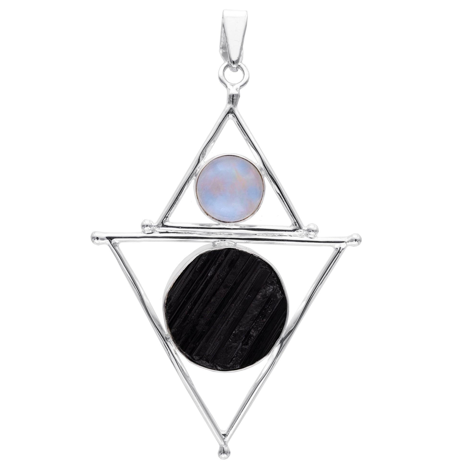 A combination of brilliant stones with a mystical design. A double triangle elemental symbol incorporates Earth, Spirit, and the Goddess.